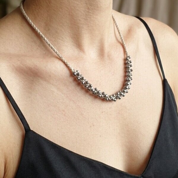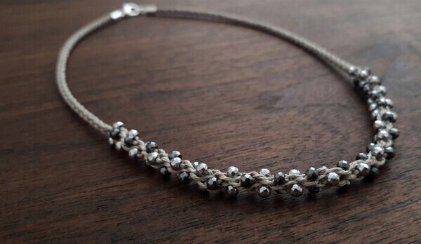 Collier tressé en fils de lin et perles d’hématites (pierres de couleurs gris / noir irisée).