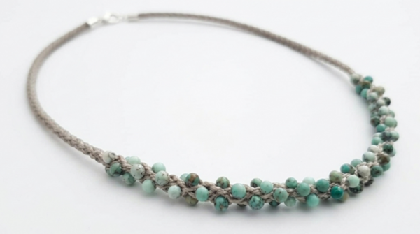 Collier tressé en fils de lin et perles de turquoises (pierres aux nuances bleues et vertes).
