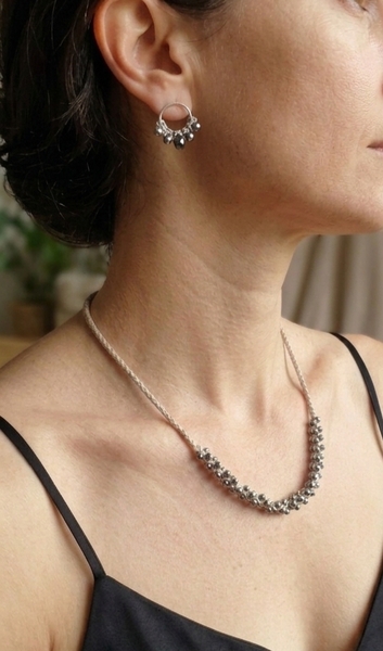 Les hématites sont des pierres de couleur gris/noir avec des reflets irisés. Elles contrastent très bien avec l’aspect plus brut de la fibre de lin.