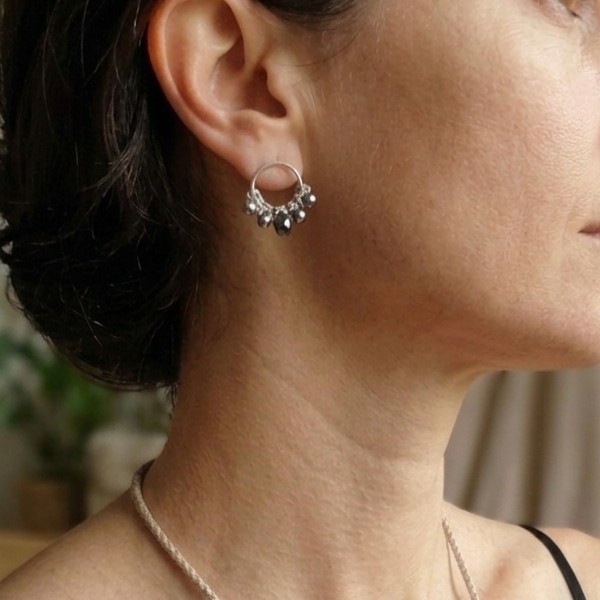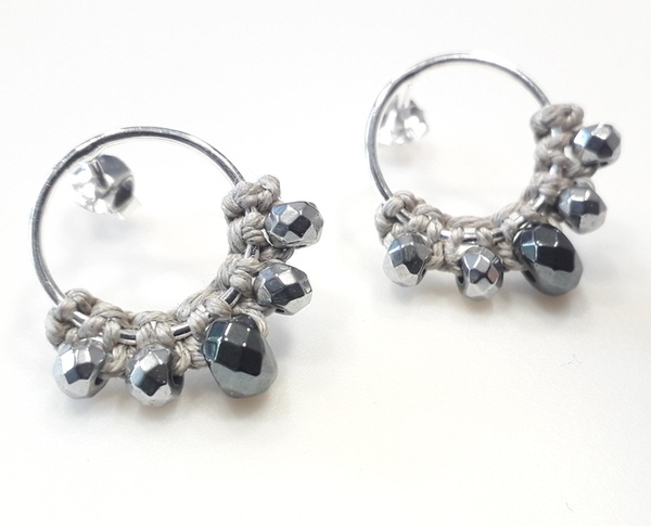 Puces d’oreilles en argent 925 sur lesquelles sont tissées des perles d’hématites avec du fil de lin.